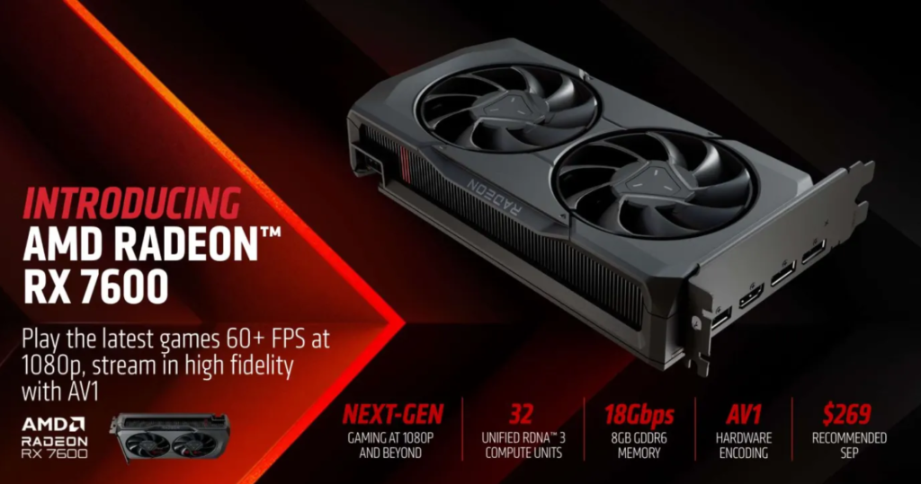 - AMD Radeon RX 7600, commonly priced around $329.99 in the US.
